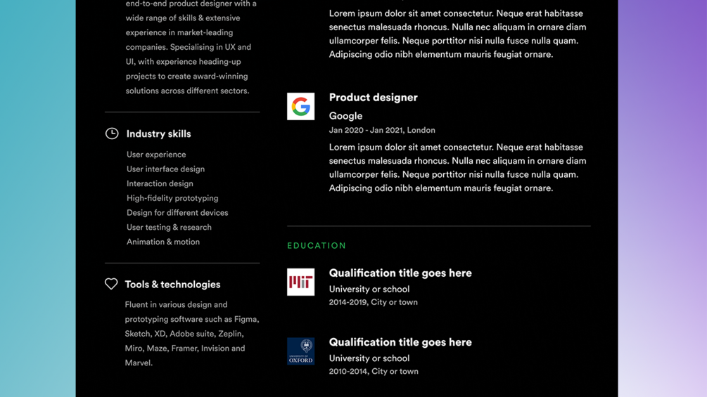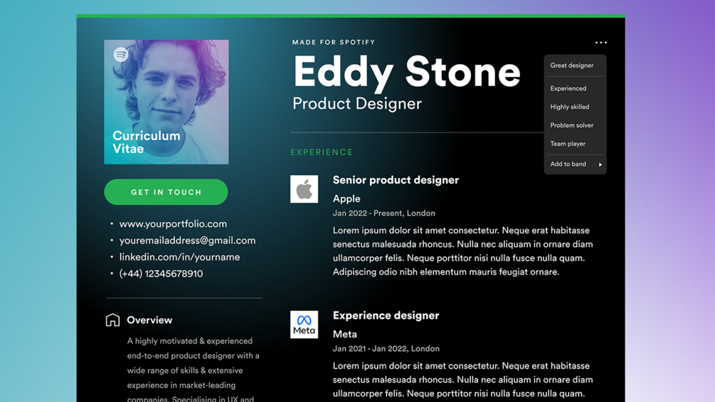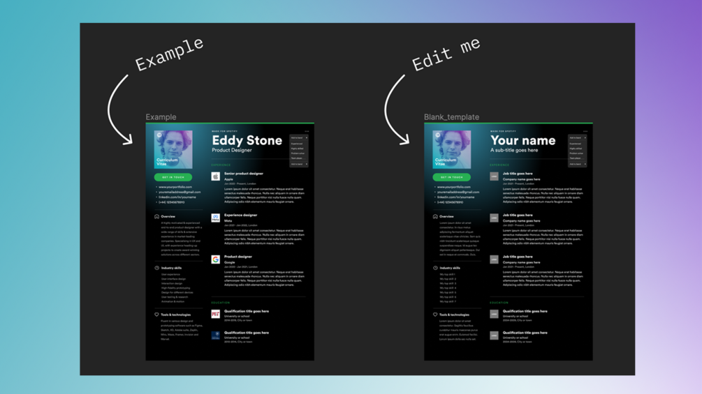 A high quality fully customisable A4 Spotify-themed Figma CV template. This is the perfect solution for anyone wanting to create a statement and stand out with their Spotify job application. Maximise time and efficiency to streamline your Spotify application!